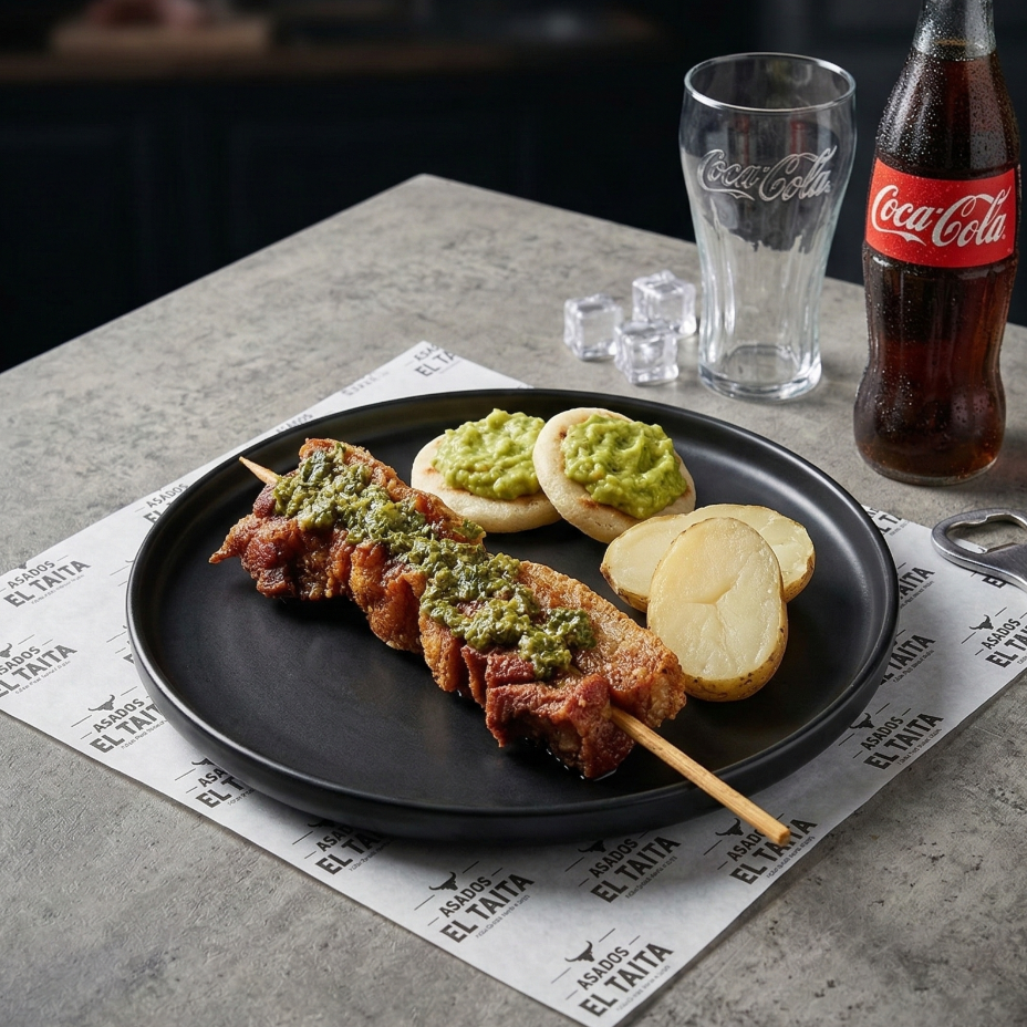 Chuzo de chicharrón, acompañado de papa cocida, arepita, guacamole, chimichurri y gaseosa 250