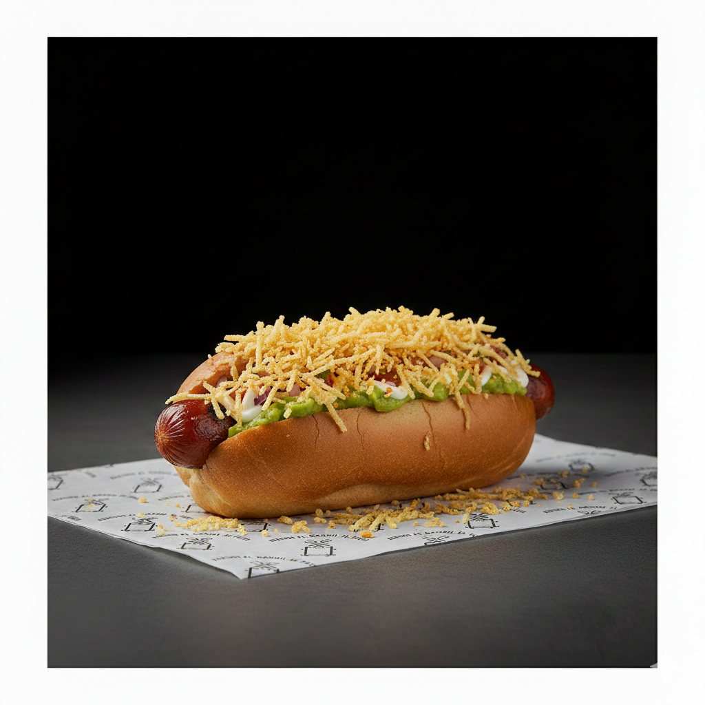 Pan, salchicha, queso mozzarella, tocineta, preparación de la casa, ensalada, cebolla y ripio.