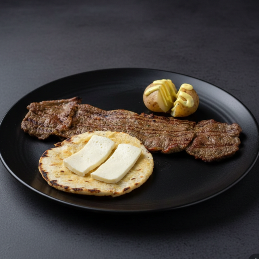 Acompañado de (2 opcones): papa al vapor, papa a la francesa, arepa con queso o ensalada