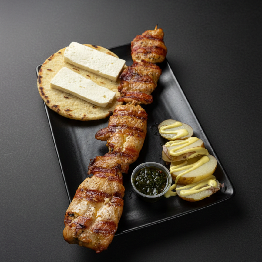 Acompañado de (2 opcones): papa al vapor, papa a la francesa, arepa con queso o ensalada.