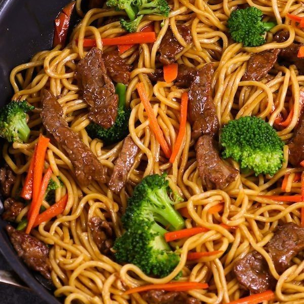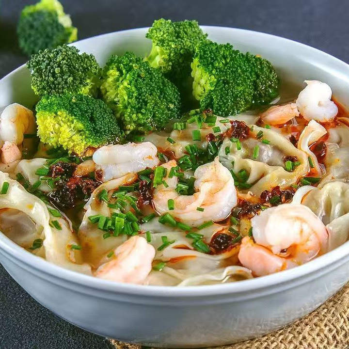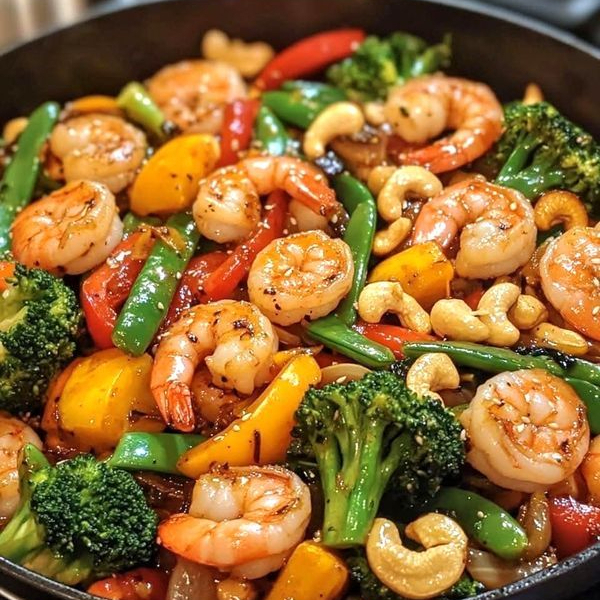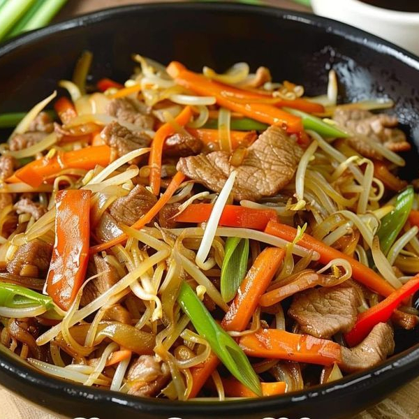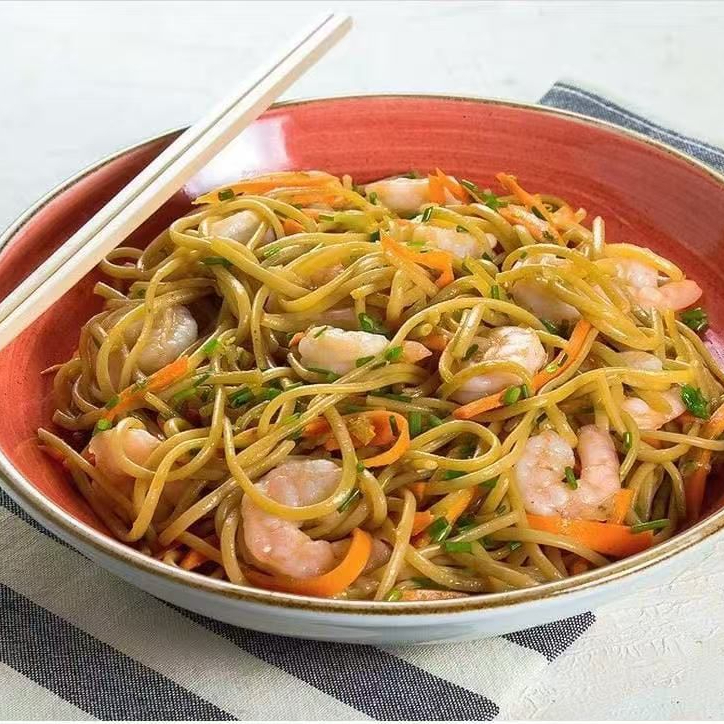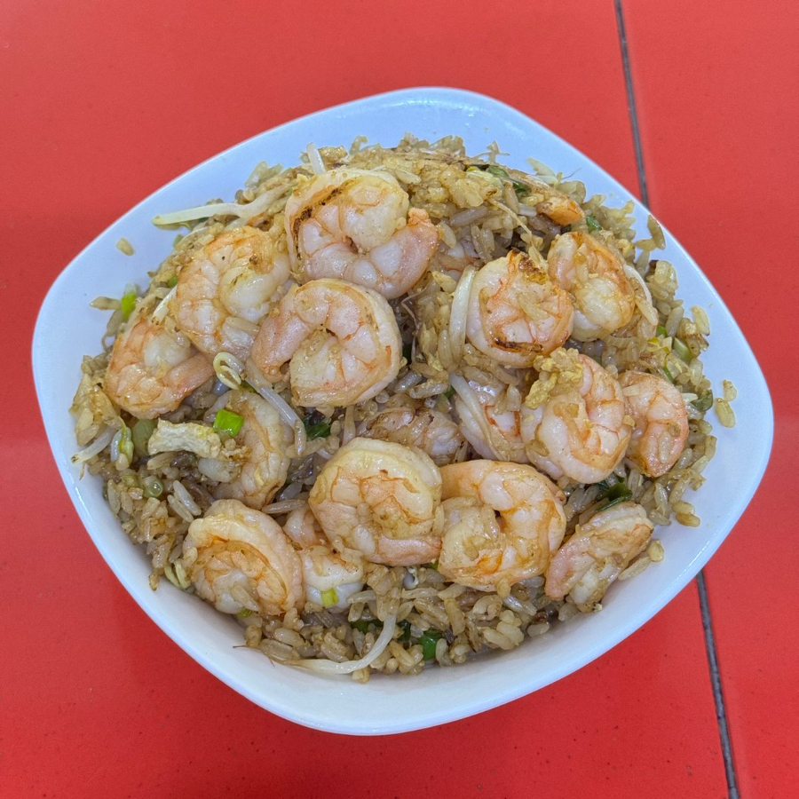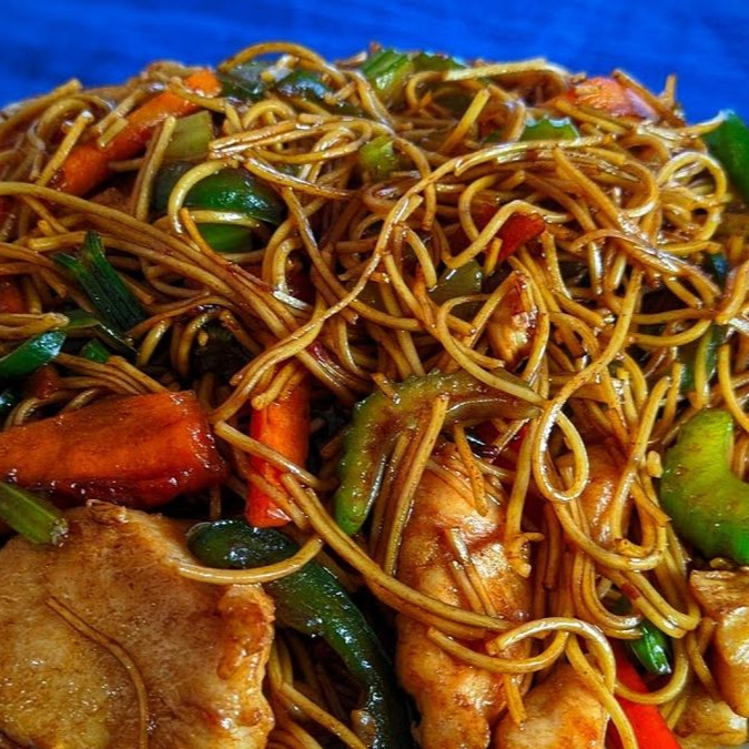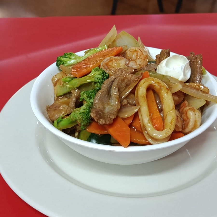 Langostinos, pollo, res, cerdo, jamón y vegetales en salsa de soya.