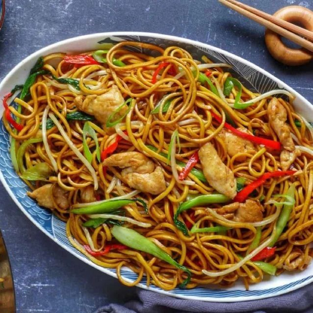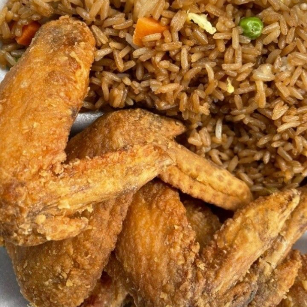 1 Pollo entero o 8 muslos o 8 costillas BBQ o 4 róbalos, arroz chino grande y chop suey.