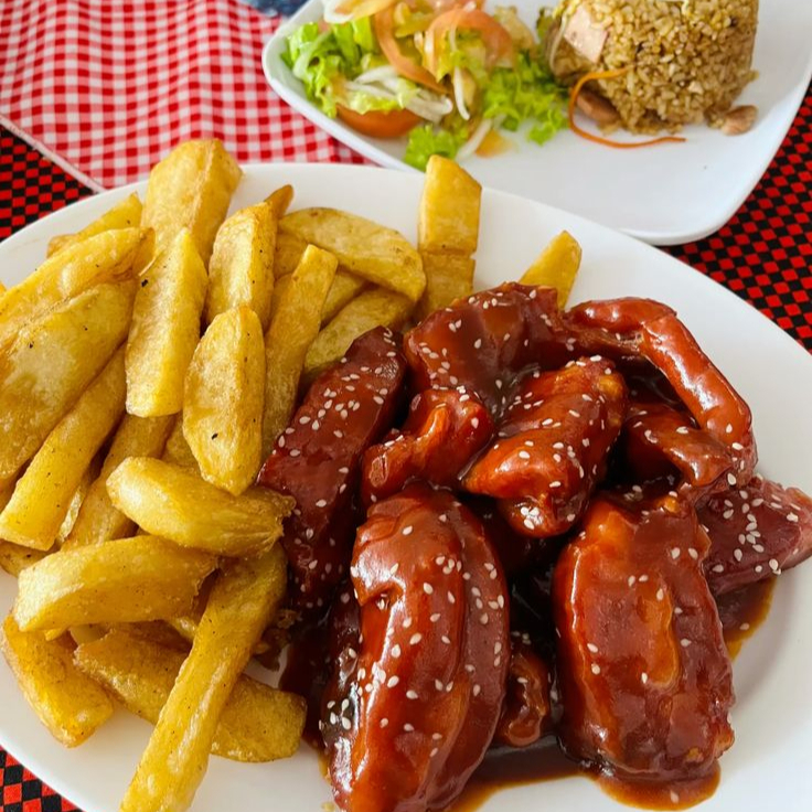 2 Muslos o 1/4 de pollo o 3 costillas BBQ o 1 róbalo, arroz chino pequeño y papas fritas.