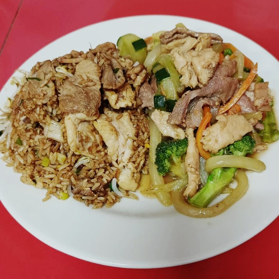 1/2 pollo o 5 muslos o 5 costillas BBQ o 2 róbalos, arroz chino mediano y chop suey.