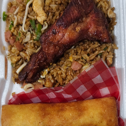 Camarón, pollo, cerdo, jamón, huevo, raíz China, cebollín.