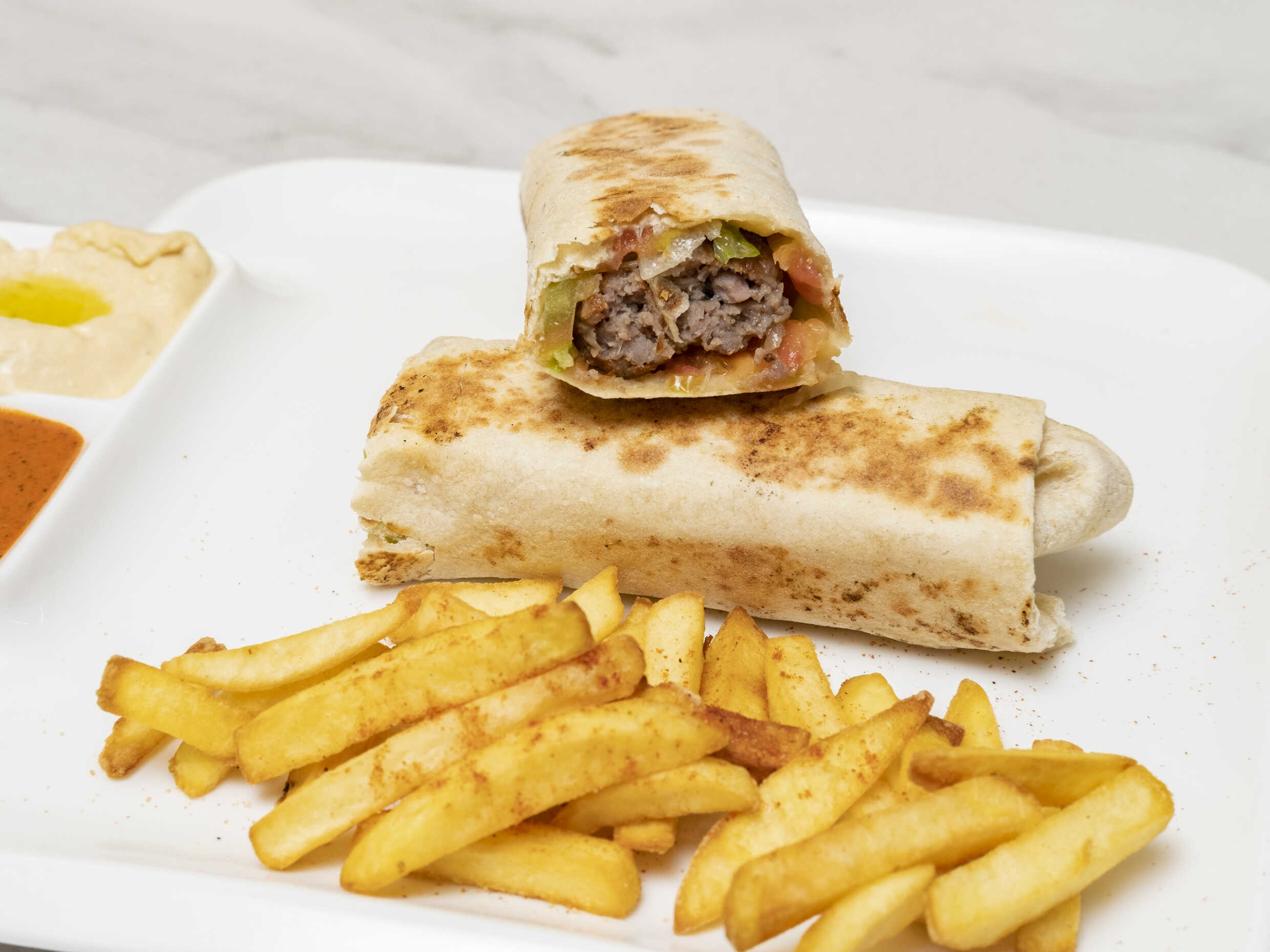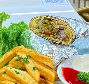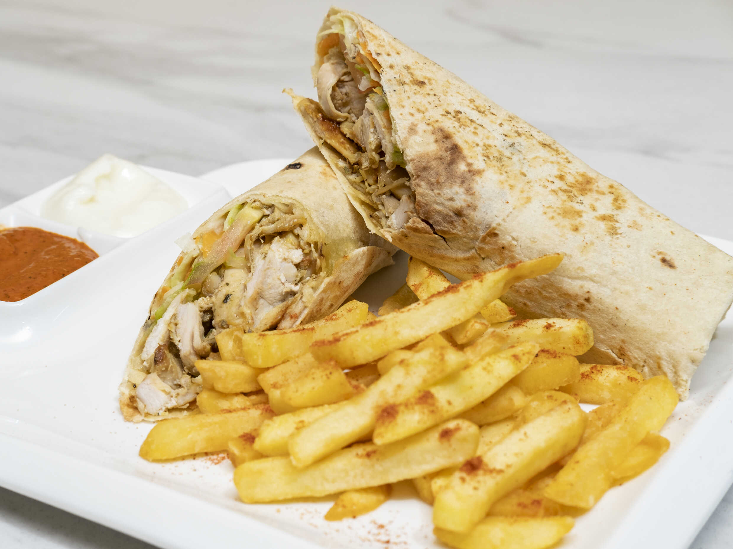 Suculenta mixtura de pollo y carne con salsa de ajo especial, dentro de un pan árabe, wrap especial del medio oriente, acompañado de papas a la francesa.