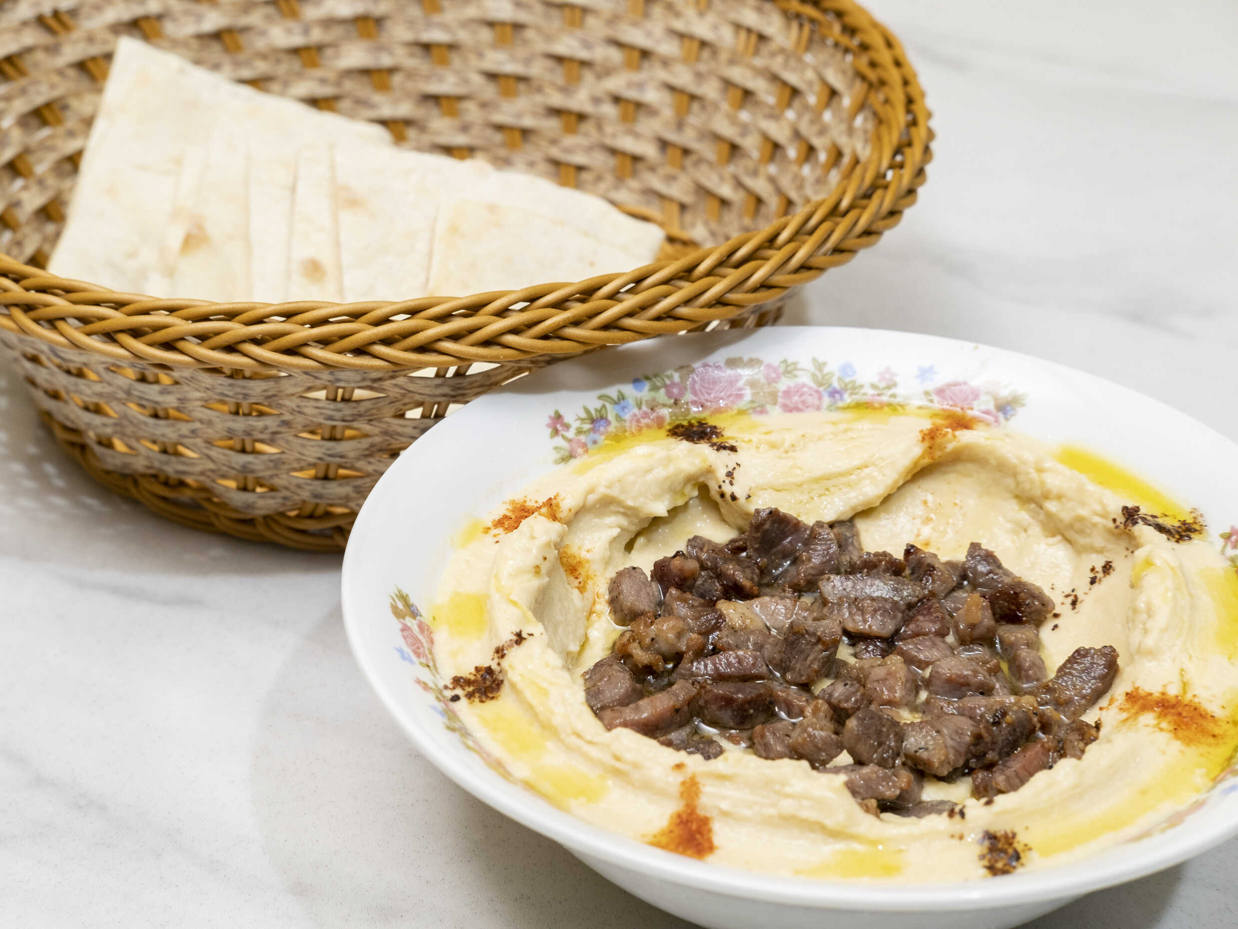 Especialidad del medio oriente, puré de garbanzos con ajo, limón, tahini, perejil y aceite de oliva, servido con carne molida y pan árabe.