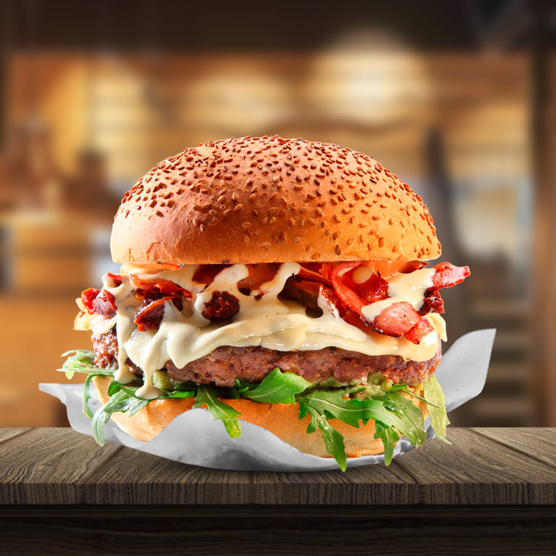 Pan artesanal, carne de res, tocineta ahumada, queso mozzarella, lechuga crespa, tomate, cebolla morada + Papas a la francesa. (aprox. 150g)