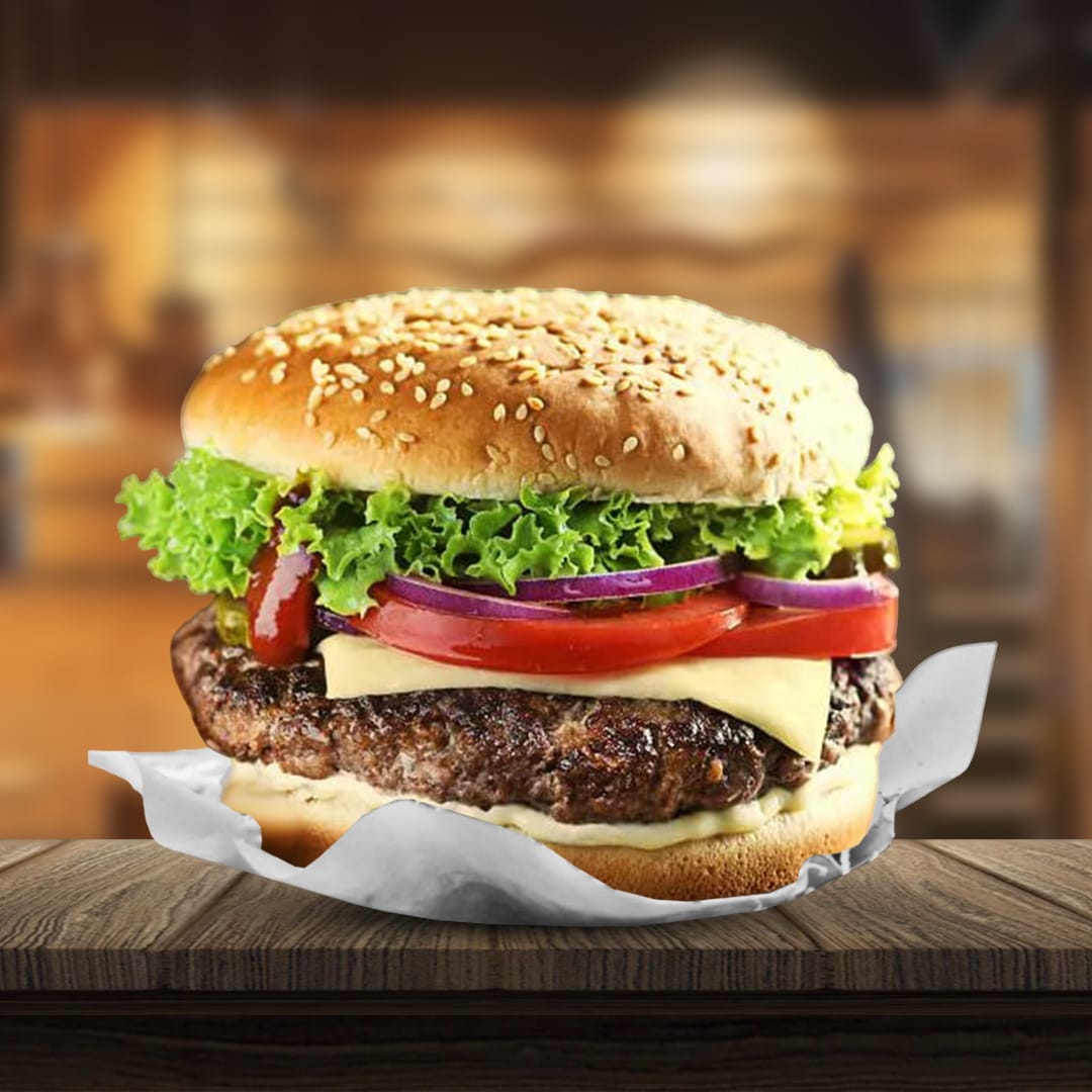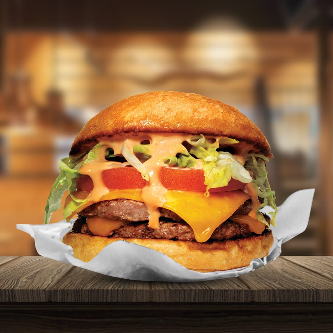 Hamburguesa, doble carne, queso cheddar, lechuga romana, tomate, cebolla + Papas a la francesa.