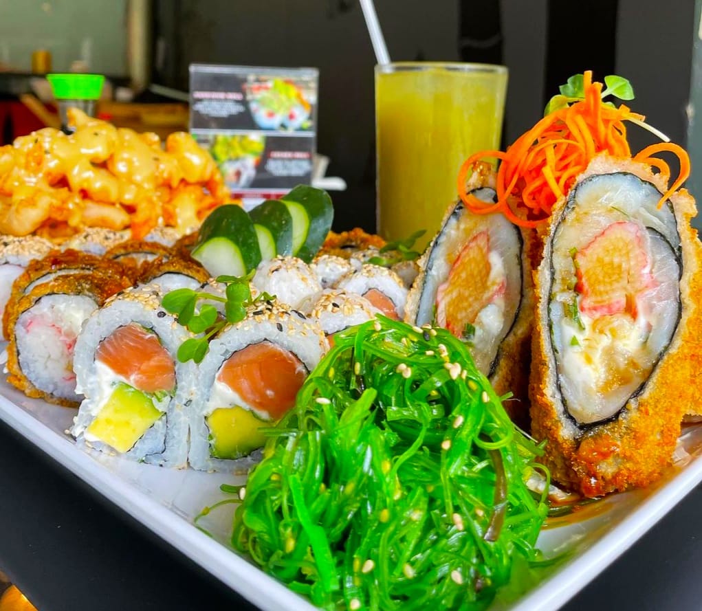 Atún marinado, palmito de cangrejo, repollo morado, mango, aguacate, algas marinas, zanahoria, pepino, cebollín y ajonjolí, acompañado de bebida.