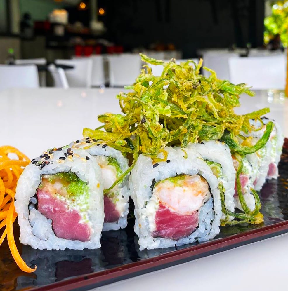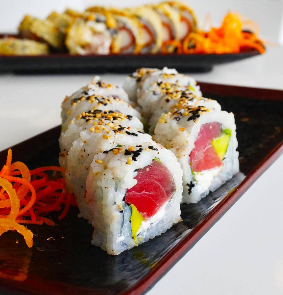 Atún, queso crema y wakame ,pepino, con topping de aguacate y ajonjolí.
