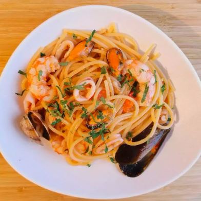 Pasta con camarones, langostinos, calamar, mejilllón, pulpo, vegetales, ajonjolí, acompañado de bebida.