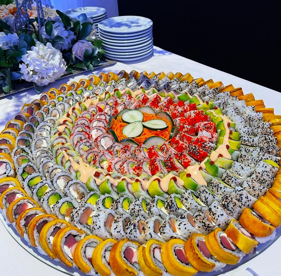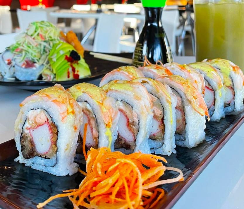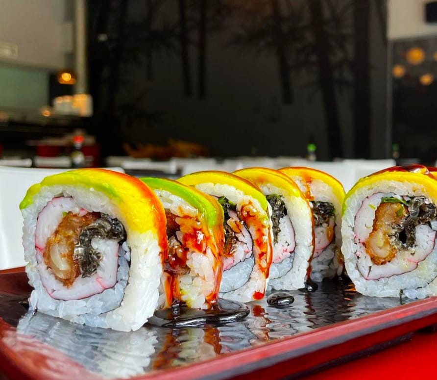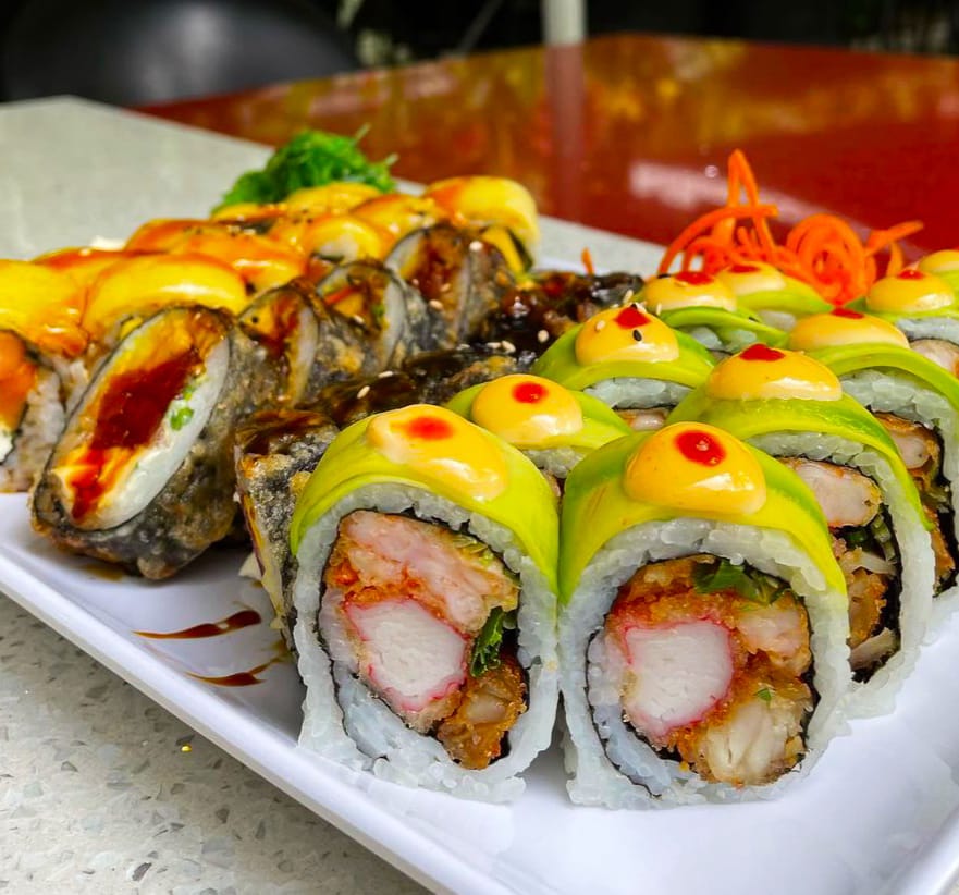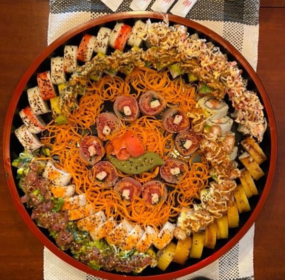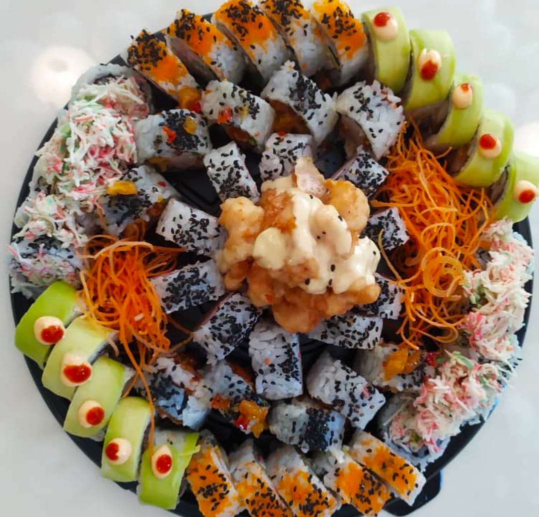 40 bocado de sushi. 10:bocados dinamita,10;bocado platano roll apanado 20 bocados apanados mas 2 bebida del dia