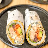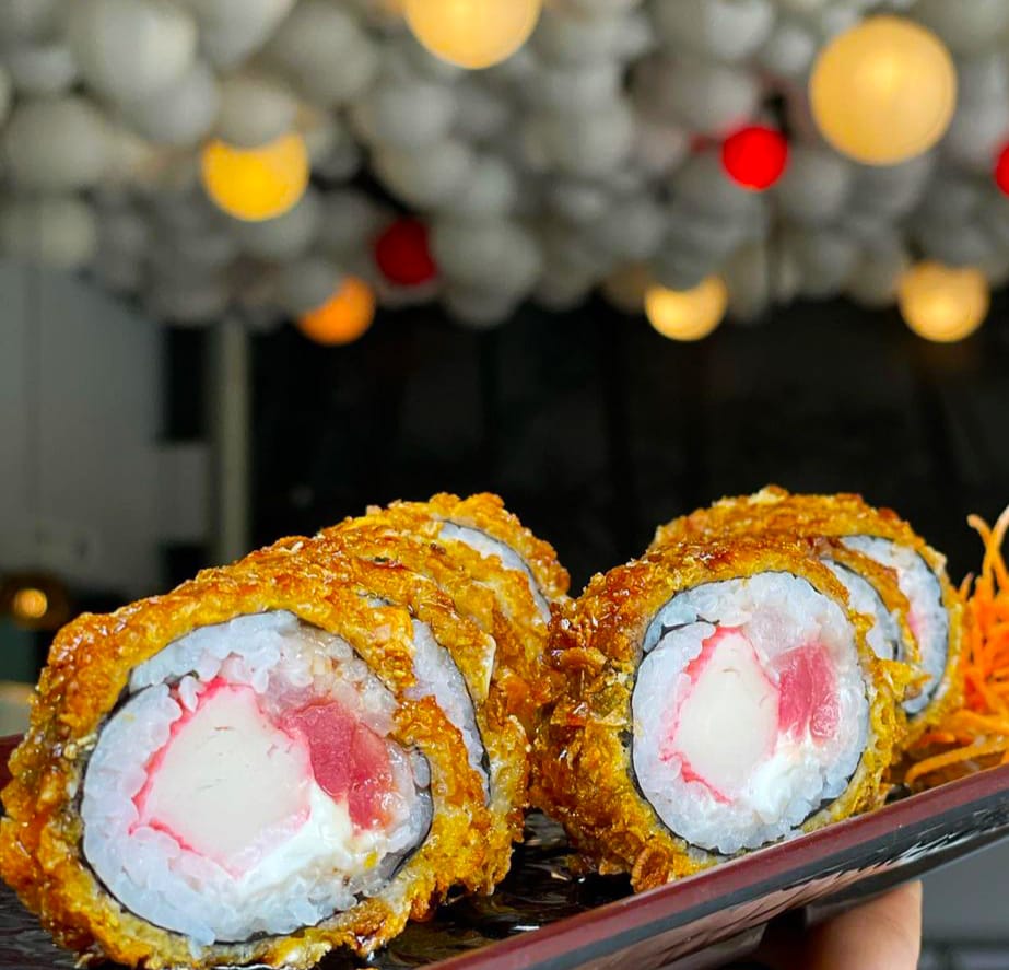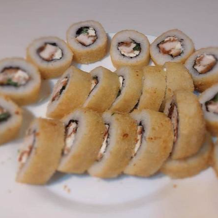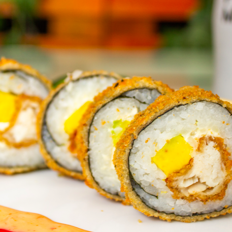 Salmón, aguacate, pepino ,queso crema, totalmente apanado.