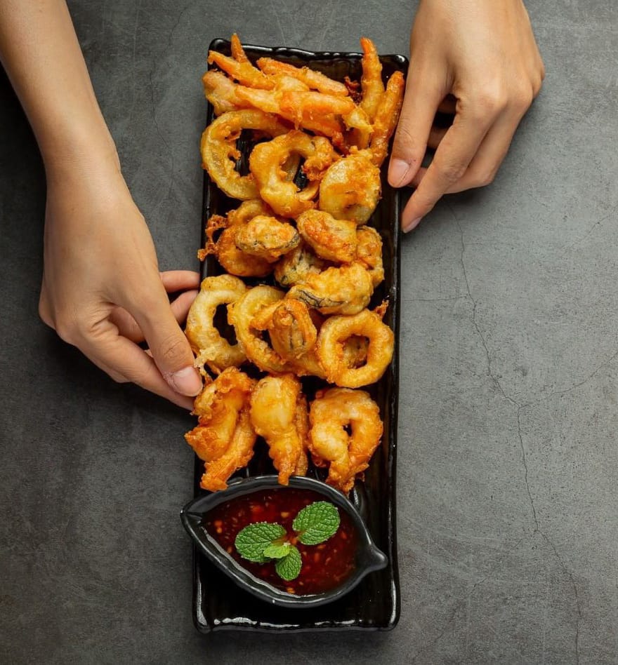 10 unidades de aros de calamar apanados bañados en salsa teriyaky.