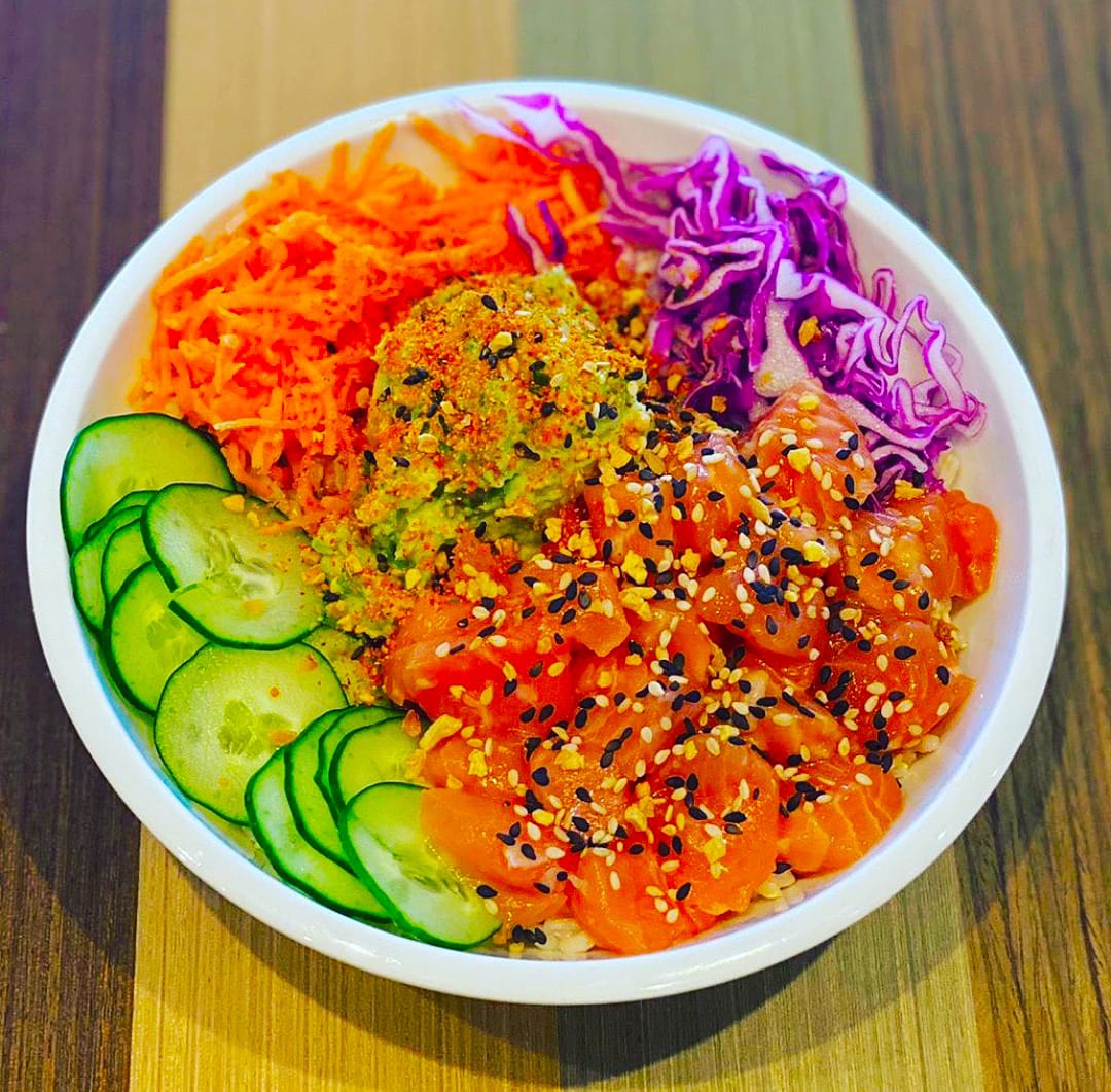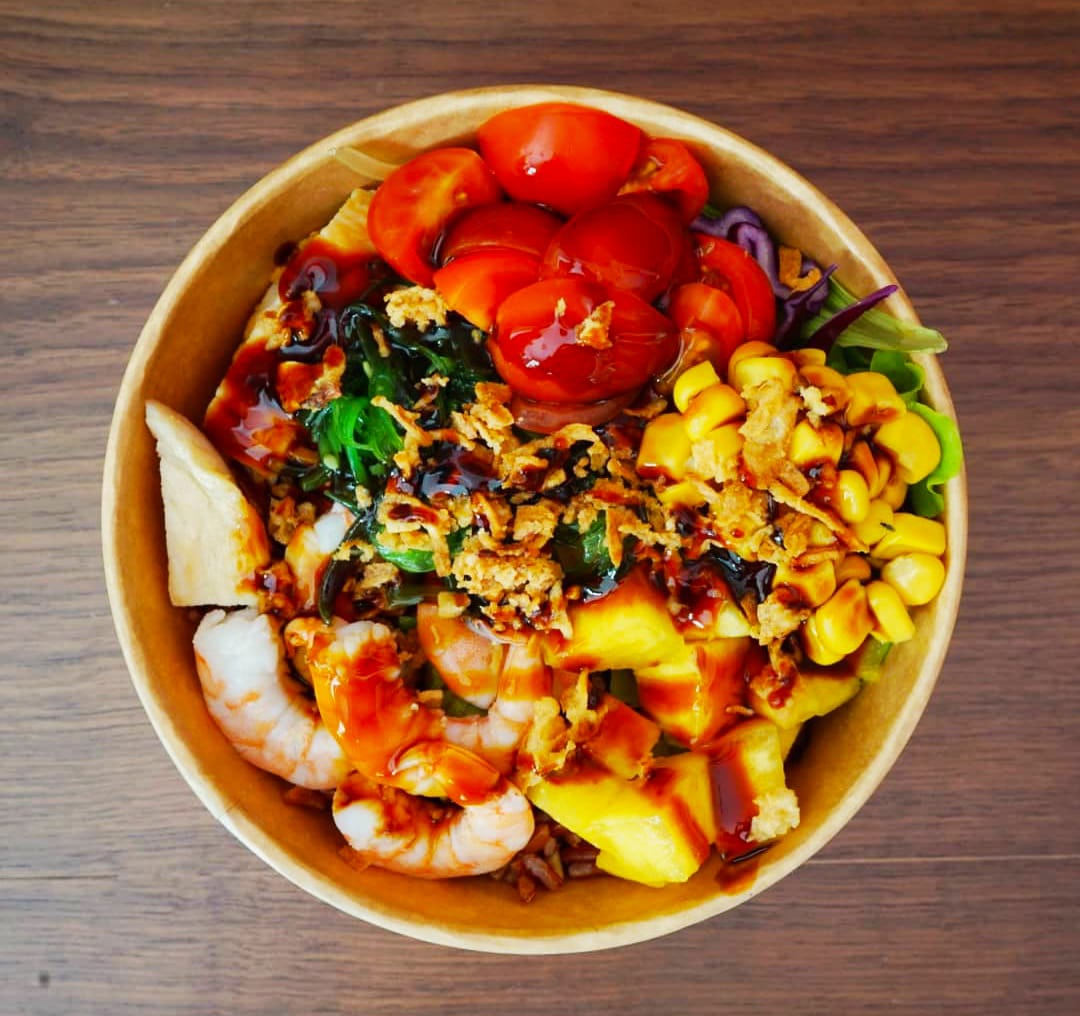 palmito julianas, camarones, aguacate, mango, piña, maíz, zanahoria, base de tu elección, ajonjolí, salsa poke, acompañado de bebida.