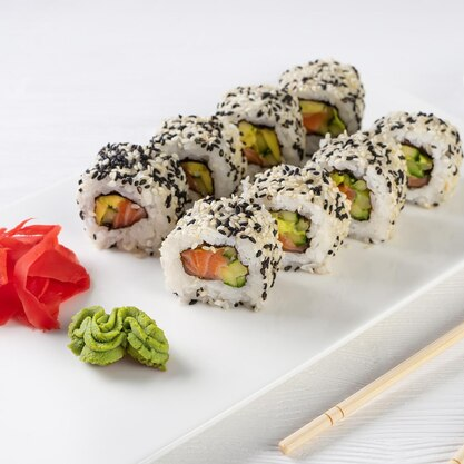 Salmón, aguacate, pepino,queso crema con topping de ajonjolí y masago.