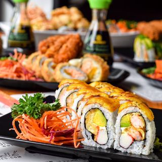 70 Bocados de sushi 7 sabores a elecion del chef , 10 anillos de calamar apanados, 8 unidades de palmitos tempura y coca cola 1. ml.