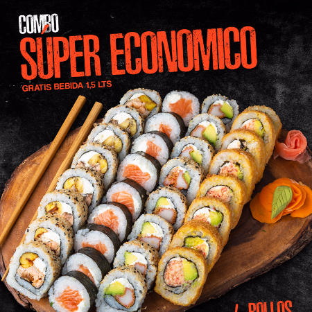 50 bocados de sushi 5 sabores, apanado roll, california, salmón skin, dinamita roll, platin roll, coca-cola sabor original 1.5 ml y postre del dia.