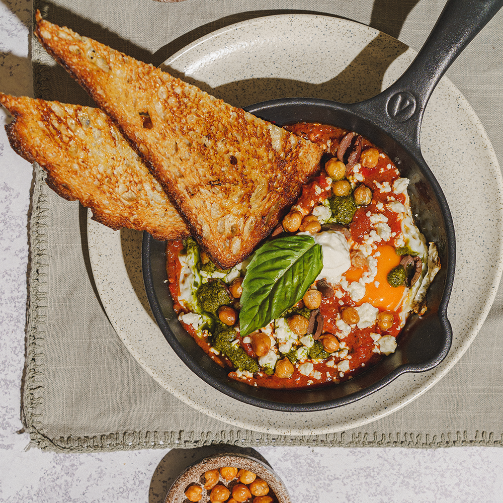 Huevos en salsa de pimentones y tomate, con aceitunas, garbanzos crocantes y yogur griego, finalizado con pesto, queso feta y albahaca. acompañado de pan sourdough.