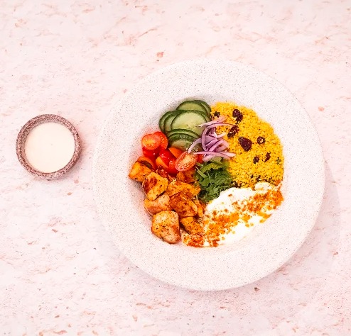Pollo marinado en especies del medio oriente, cous cous, tomates uvalina, pepino cohombro, yogur griego, albahaca y cebolla morada, acompañado de una vinagreta de vino blanco y finalizado con chile en polvo y cilantro.