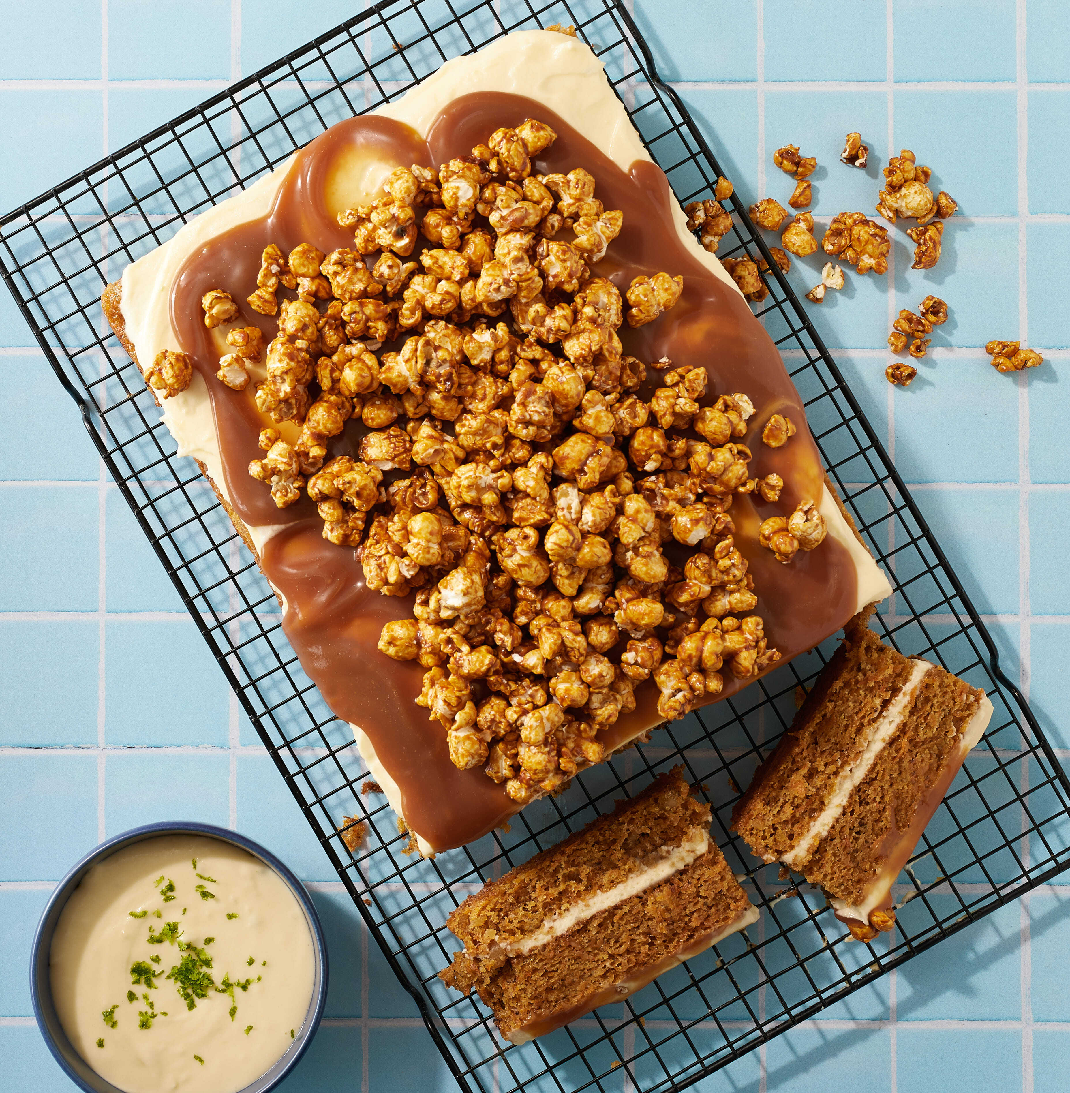 Torta para 12 porciones de zanahoria con caramelo y popcorn caramelizado.