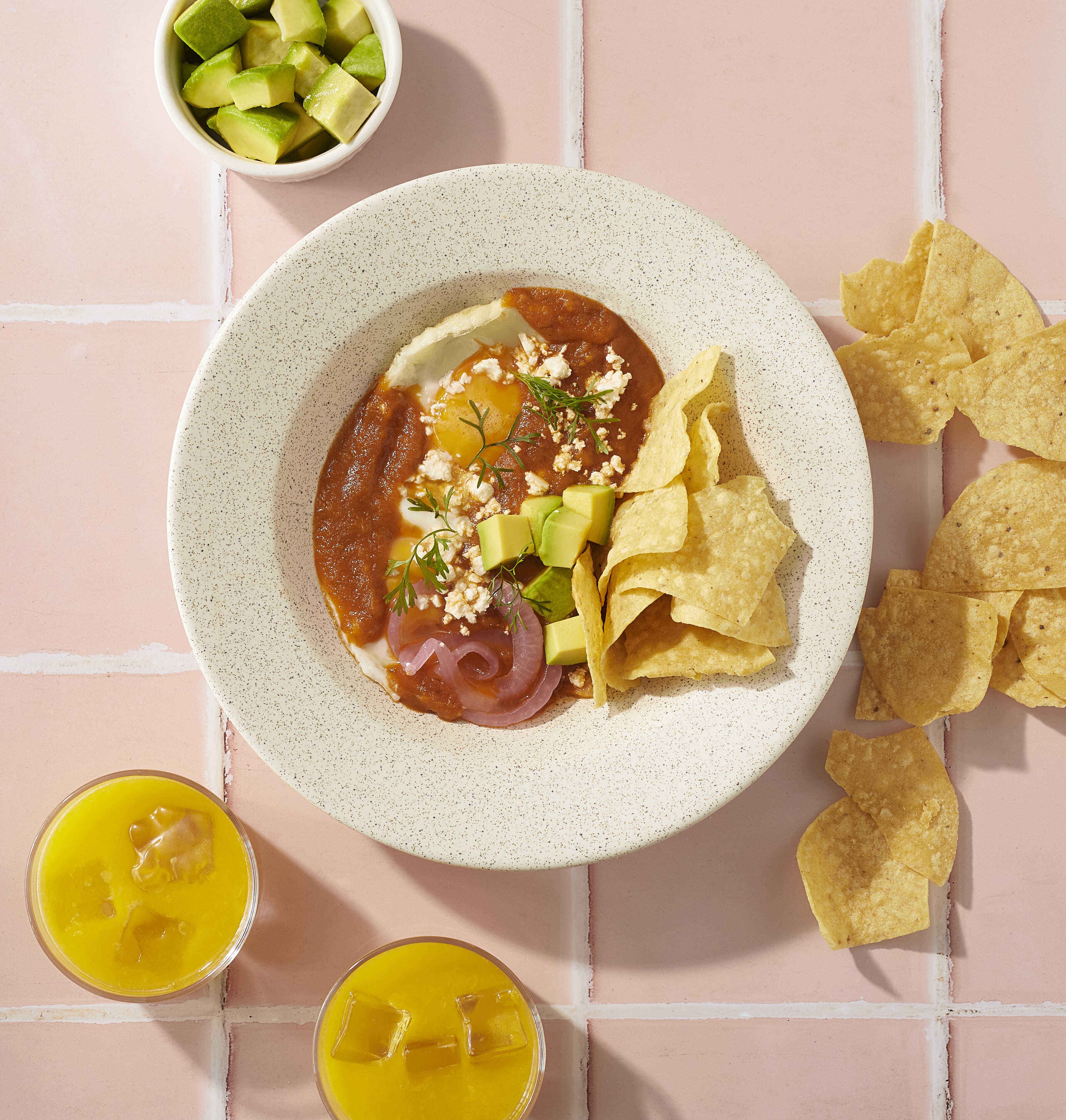 Huevos fritos con totopos en salsa de tomates rostizados y chile ancho y guajillo, huevos fritos, cebolla encurtida, queso feta, yogurt griego y cilantro.