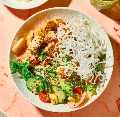 Bowl de filete de salmón con ensalada de quinoas, tomate uvalina, cebolla morada, pepino europeo, almendras, hierbabuena, albahaca, rábanos y una vinagreta de gulupa