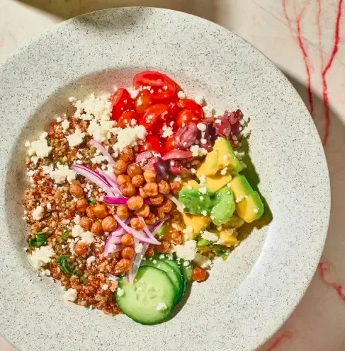 Quinoa blanca y roja, aguacate, tomate uvalina, pepino europeo, queso feta, albahaca, cilantro, hierbabuena, aceituna kalamata, cebolla morada, garbanzo crocante y vinagreta de vino blanco y gulupa.