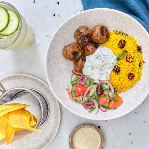Bowl de albóndigas de carne y cerdo, con cous cous, salsa tzaziki, ensalada de pepino europeo, tomate uvalina, cebolla morada, aceituna kalamata, hierbabuena, albahaca y cilantro, con vinagreta de vino blanco.