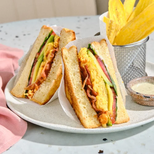 Sándwich en pan brioche con mayonesa, bbq, huevos revueltos, tomate, aguacate, rúgula y tocineta.