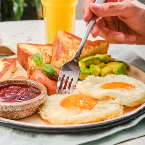 Pan brioche, huevos fritos, salchicha kohler, aguacate, queso asado, coulis de frutos rojos.