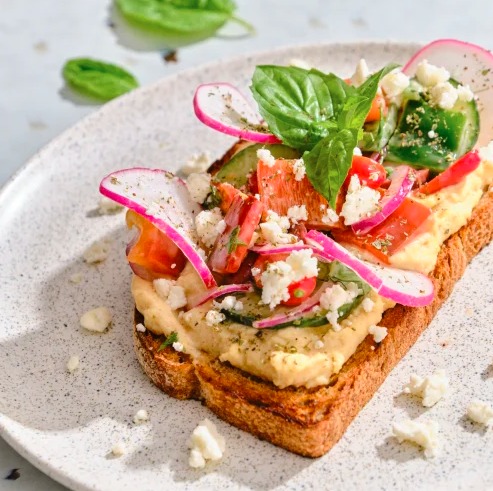 Tostada de pan sourdough con hummus de garbanzo, ensalada de vegetales frescos, mix de pimentones, tomate uvalina, pepino europeo, albahaca, cilantro, hierbabuena, rábano con vinagreta de vino blanco, queso feta y terminado con orégano seco y albahaca. .
