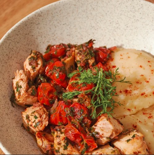 Pollo con chimichurri de tomates y perejil acompañado de puré de papa