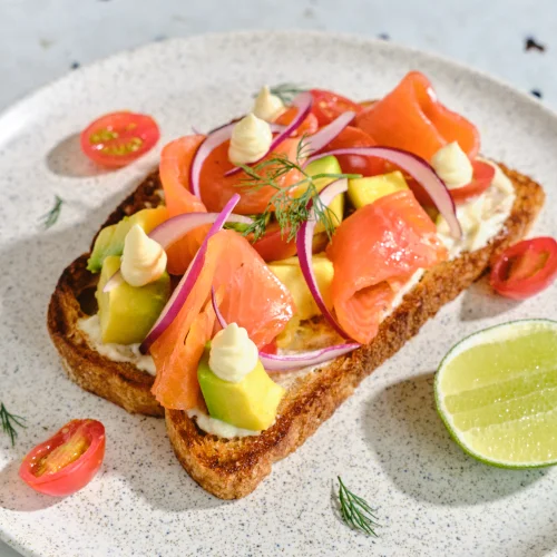 Pan sourdough, aceite de oliva, queso crema, aguacate, tomate uvalina, trucha ahumada, cebolla morada, crema agria, eneldo.