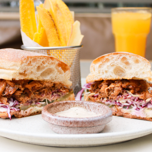 Sándwich de cerdo desmenuzado en salsa bbq, ensalada de repollo y pepinillos, acompañado de chips de yuca y plátano con salsa ranch.