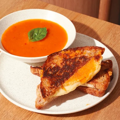 Sandwich con mix de quesos en pan sourdough acompañado de sopa de tomate