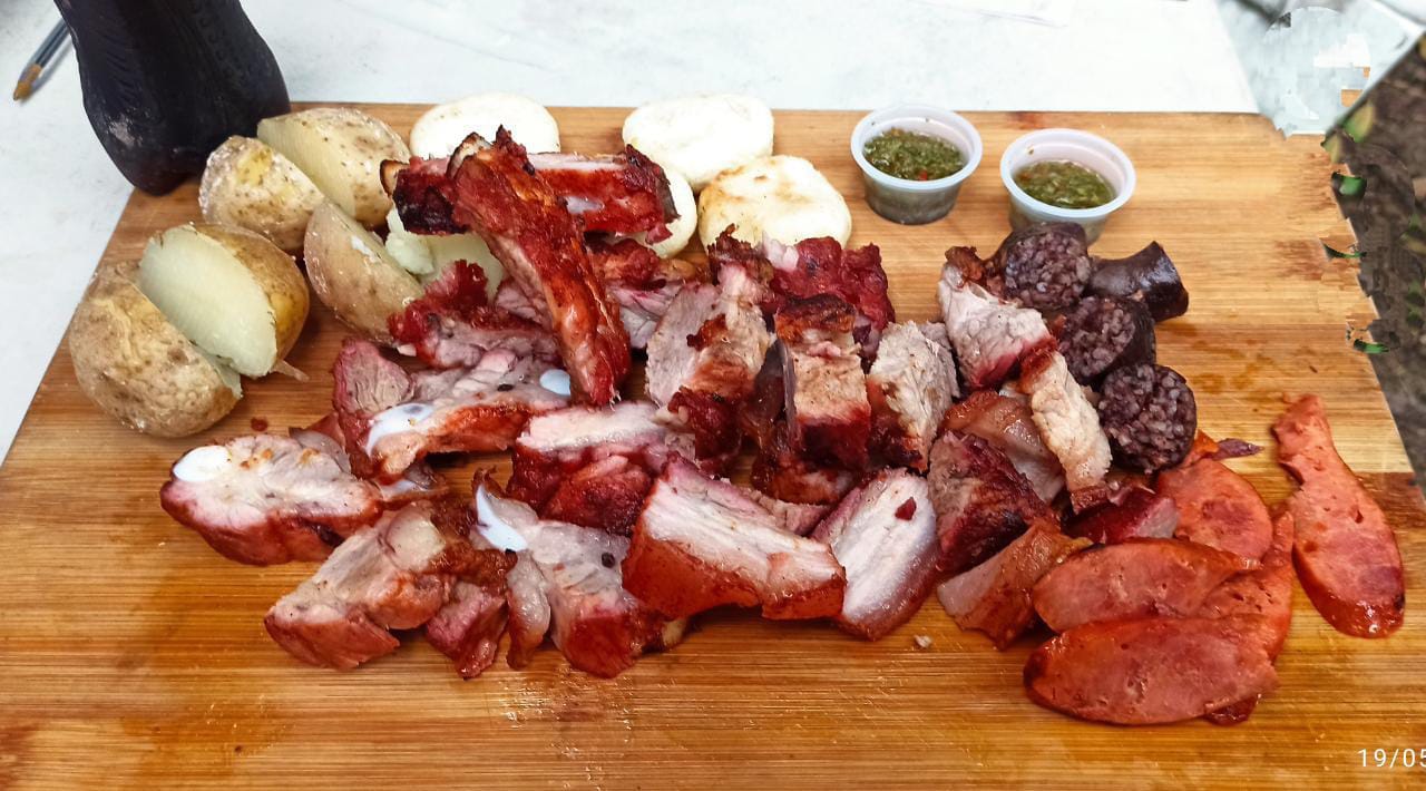 500g de costilla,chicharron,bondiolamorcilla,chorizo(puede variar segun la disponibilidad de los productos, pero siempre lleva sus respectivo 500g)). acompañado de chimichurri,papa y arepa