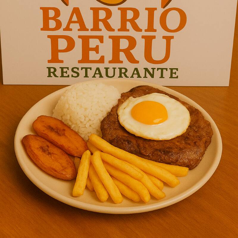 Una sabrosa chuleta de cerdo frita, acompañada de arroz graneado, papas fritas doradas, plátano maduro frito y huevo frito. ¡Un plato contundente y lleno de sabor peruano que nunca falla!