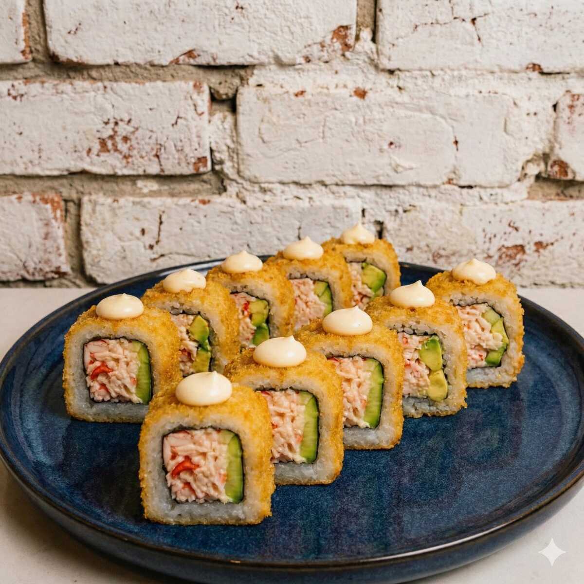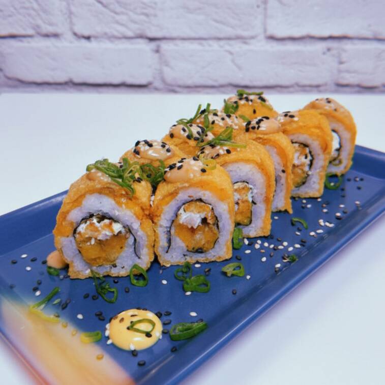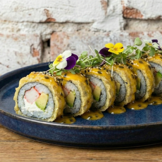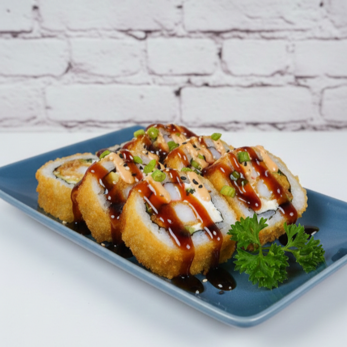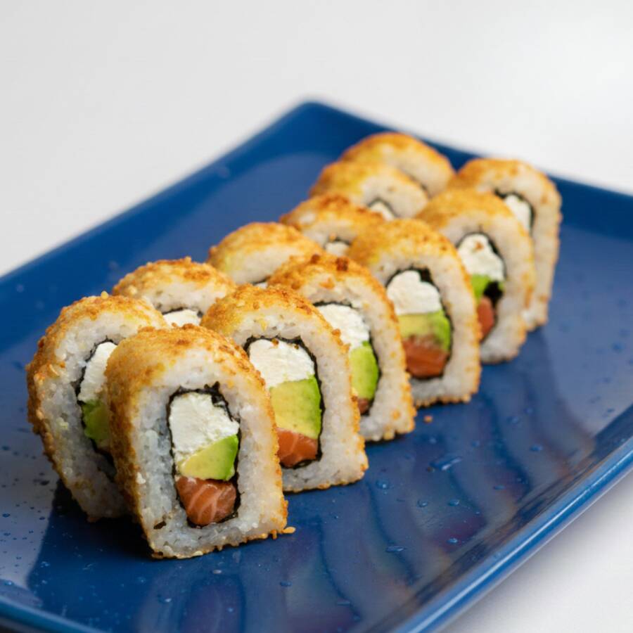 Salmón curado al romero, queso crema y aguacate, todo en un rebozado súper crocante.