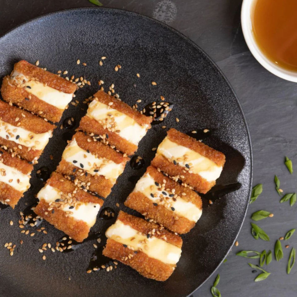 Palmitos de cangrejo apanados, rellenos de crema de queso y bañados en teriyaki.