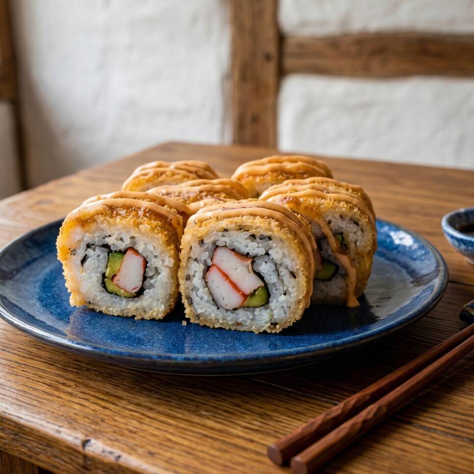 Roll crocante de cangrejo con topping spicy y teriyaki