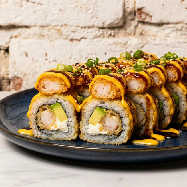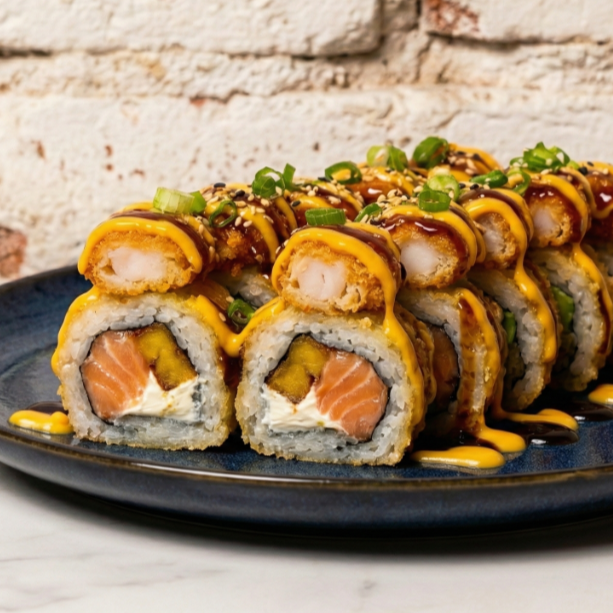 Camarón crocante y aguacate, coronado con topping de cangrejo en mayo spicy y almendras crujientes.