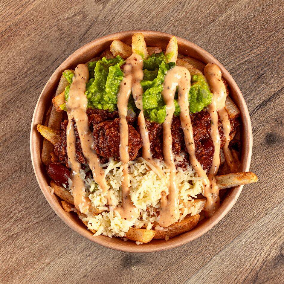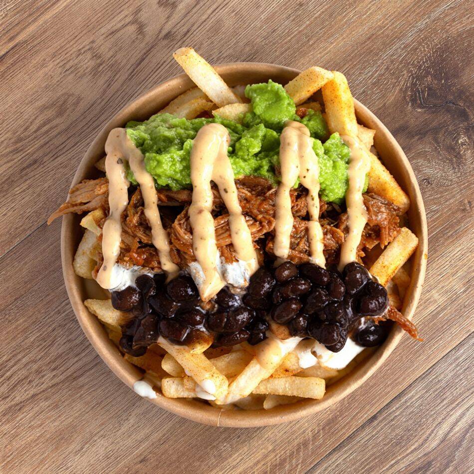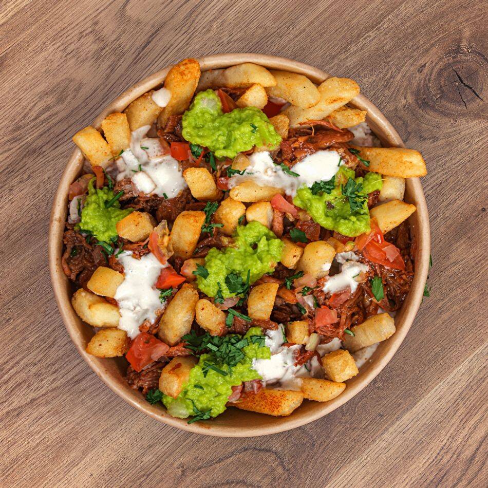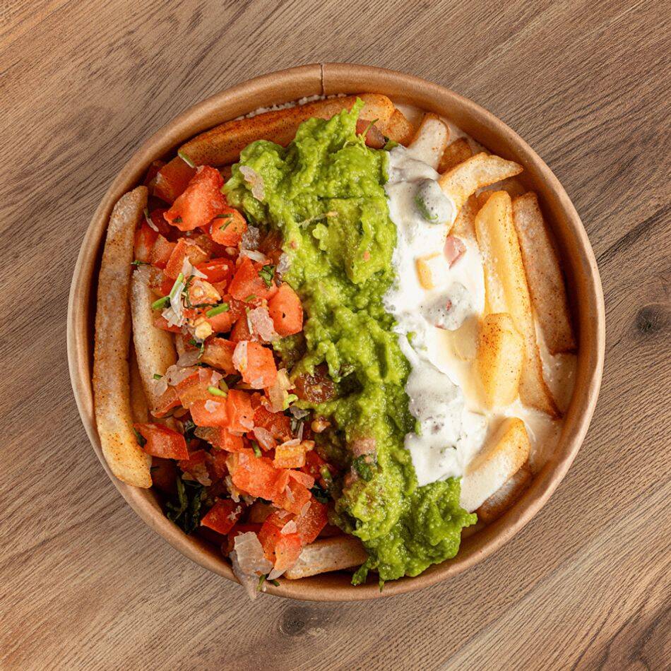Una mezcla de papas a la francesa, proteína vegetariana, pico de gallo, guacamole, sour cream y queso mozzarella.