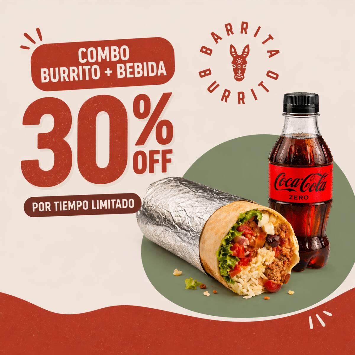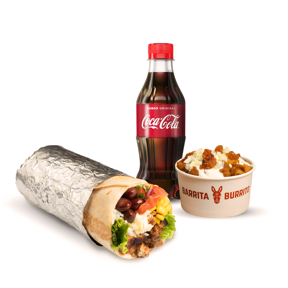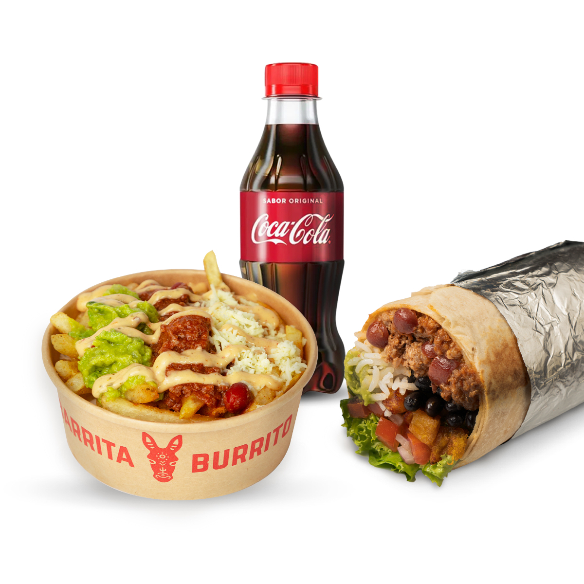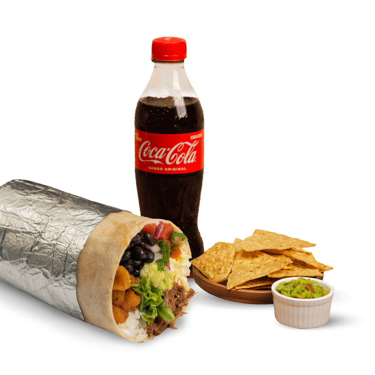 1 Burrito Milenario ( en tortilla de 25 cm de diámetro, con chili con carne + pollo o cerdo caramelizado, guacamole, queso, arroz, madurito, pico de gallo, lechuga, y una salsa) + 1 coca cola zero de 250ml.
