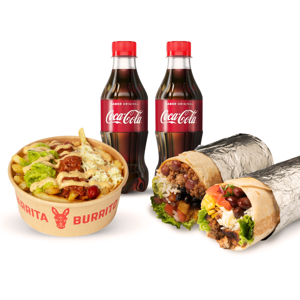 2 Burros bravos (chili, arroz, frijol, queso, lechuga, pico, madurito, salsas) mas 1 nachos con guacamole mas 2 Coca Colas Zero 250 ml.