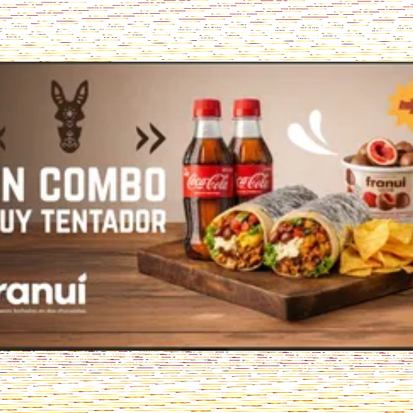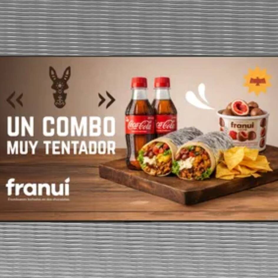 2 Burritos prearmados (burritos milenarios, proteína chili más pollo o costilla) mas 1 nachos con guacamole más 1 postre franuí de 90 g más 2 bebidas de 250 ml.
