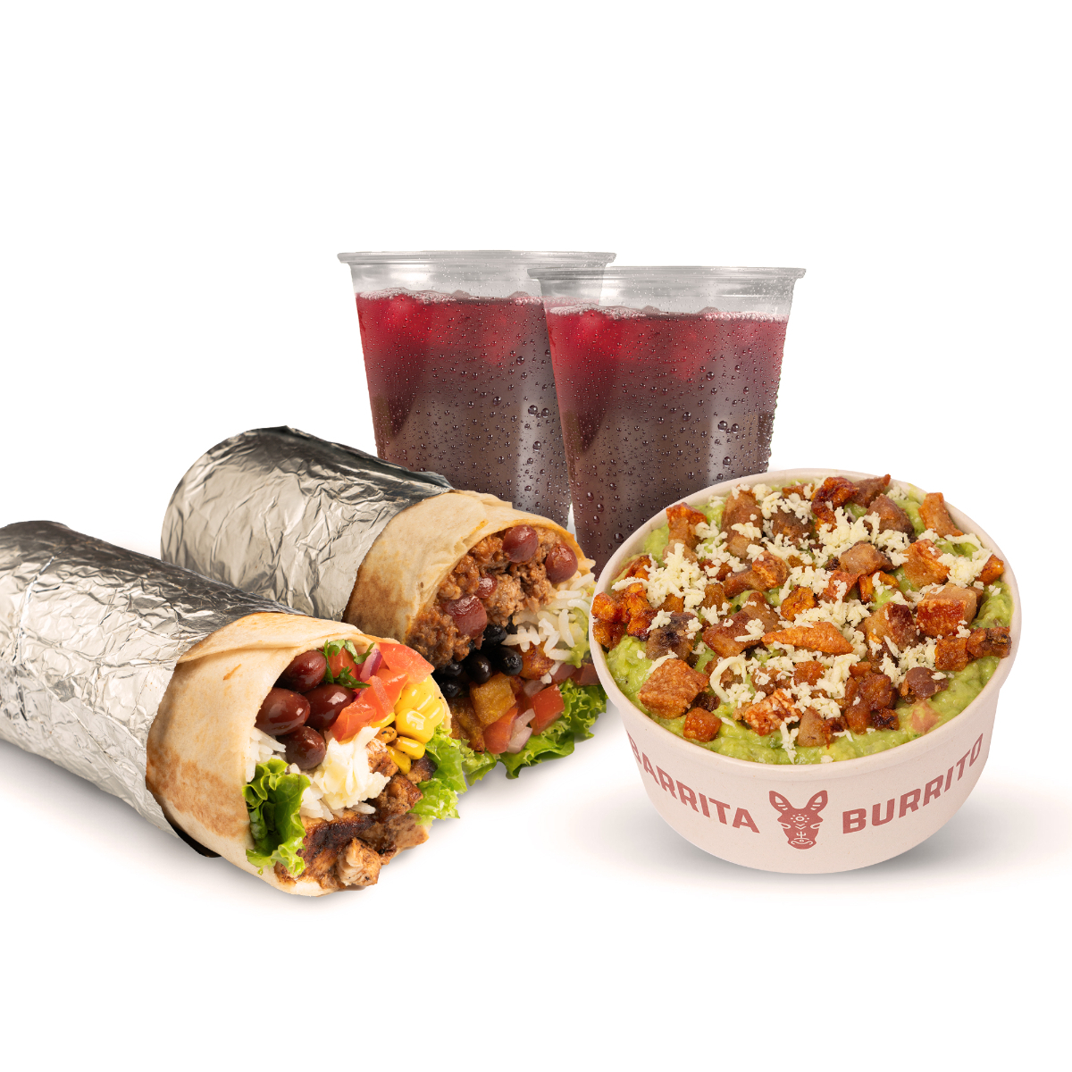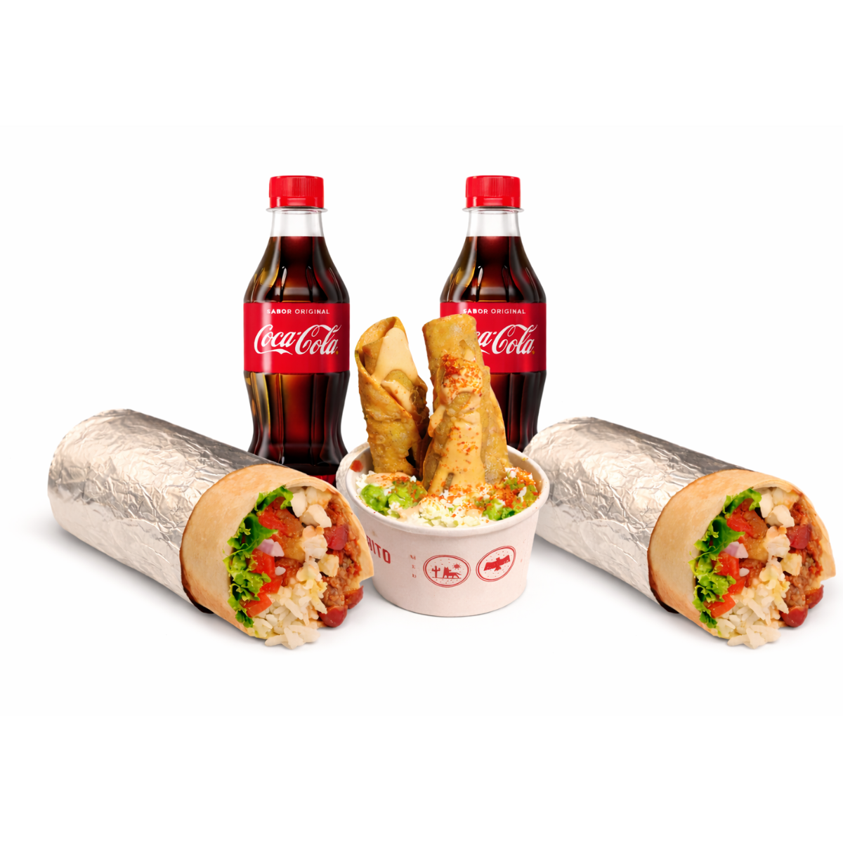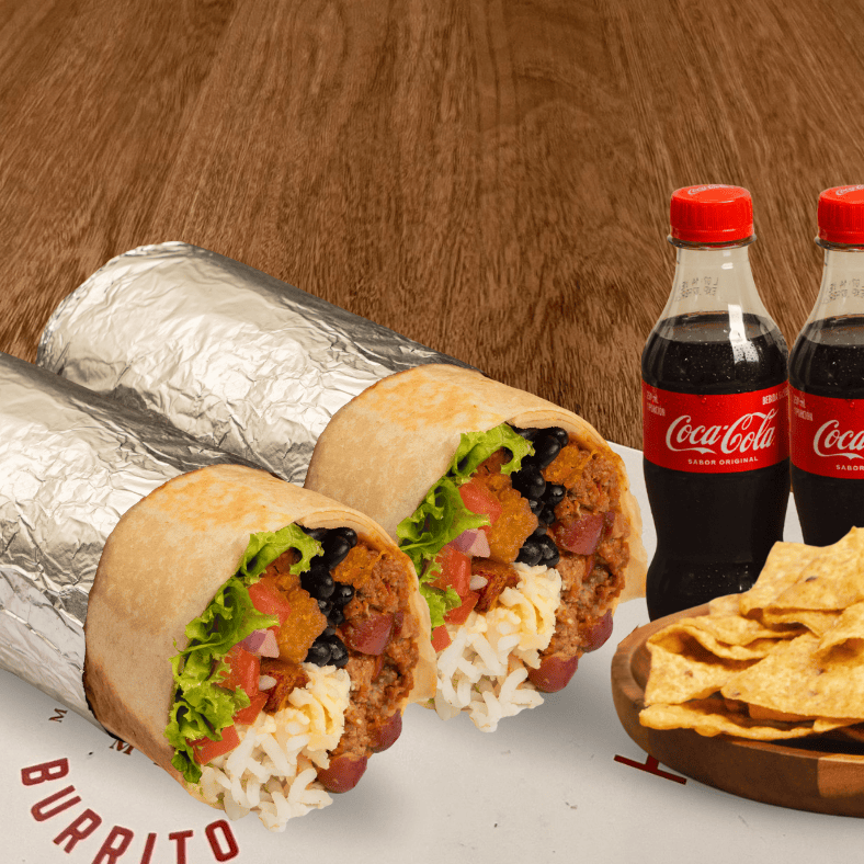 2 Burritos con la proteína de tu elección, preparados con todos los ingredientes de nuestra barra. acompañados de crujientes flautas en cama de guacamole, queso, sour cream y mayochipotle, más 2 bebidas de 250 ml.