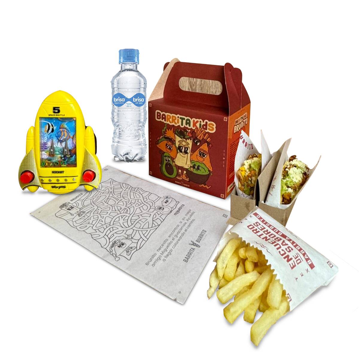 Cajita infantil, con 1 producto a elección, papitas, bebida y 1 divertido juguete.