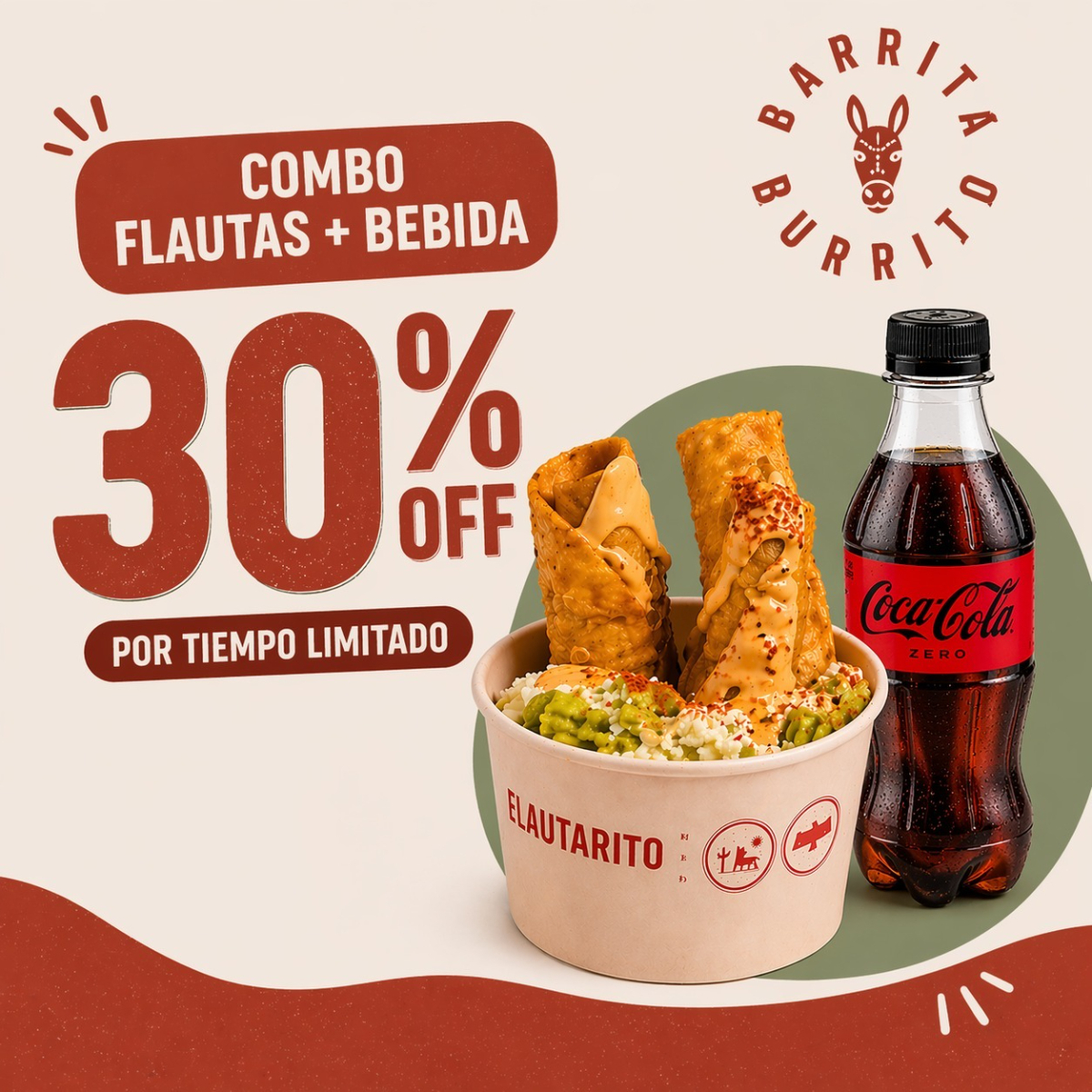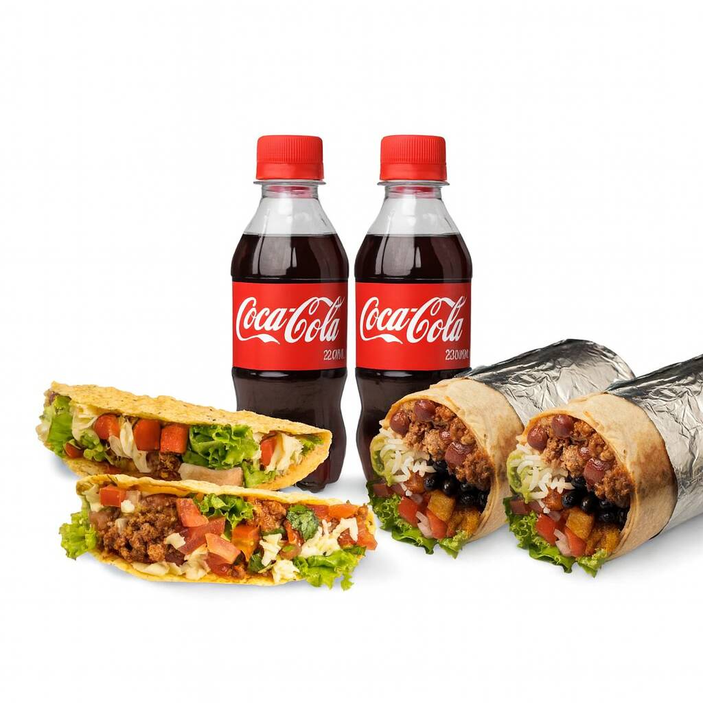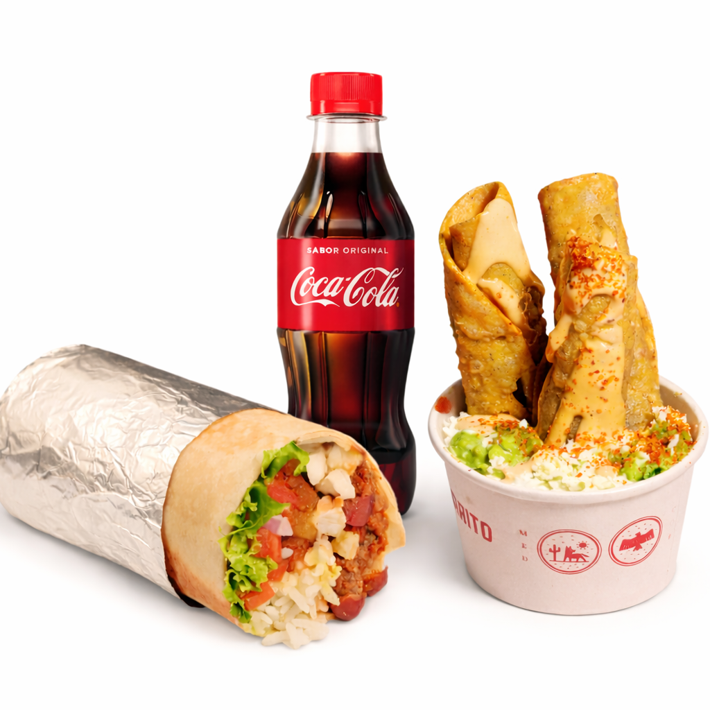 Combo perfecto: 2 mini burritos (arroz más proteína más frijol más pico más madurito más lechuga más salsa) más 2 taquitos más 2 bebidas 250 ml.
